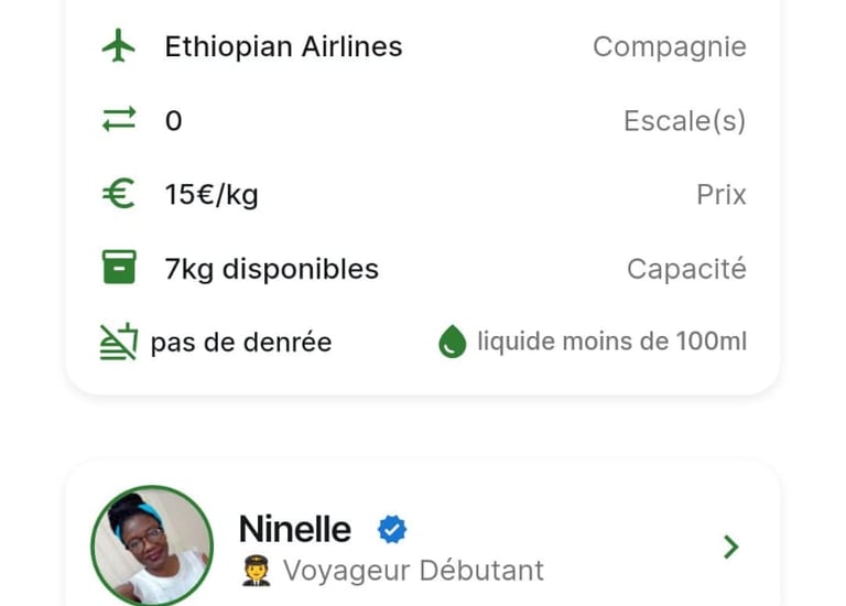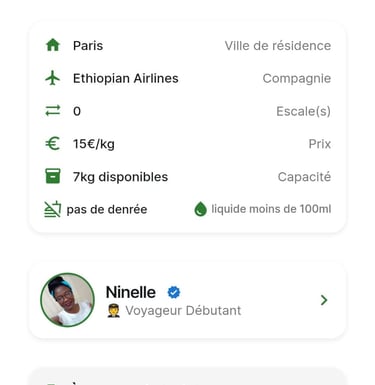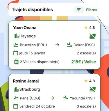 Exemple : un voyageur publie son trajet Paris → Yaoundé