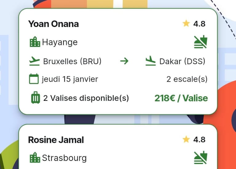 Télécharger l'application et Cherchez un trajet existant (ex : Paris → Douala) ou publiez votre demande d’envoi.
